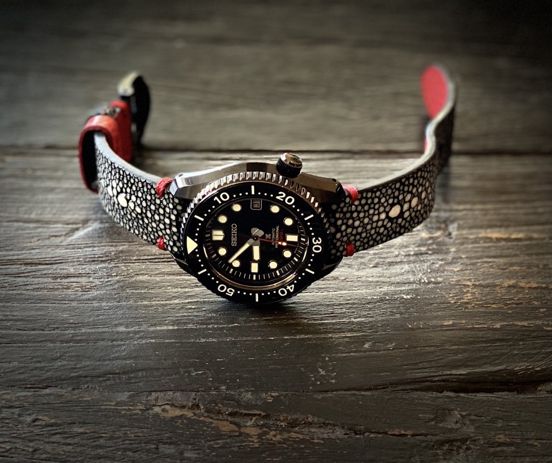 Jeg sender også med ei stingrayreim (med reimløkke i strutseskinn) laget til uret av Combat Straps. Reima er litt brukt på ei anna klokke, men ser veldig bra ut!