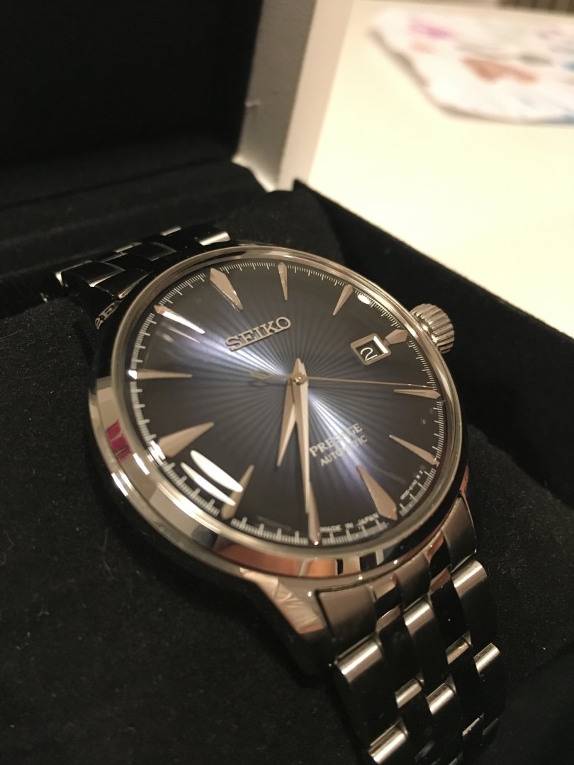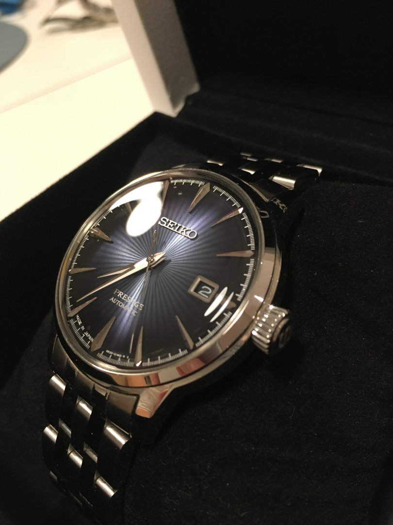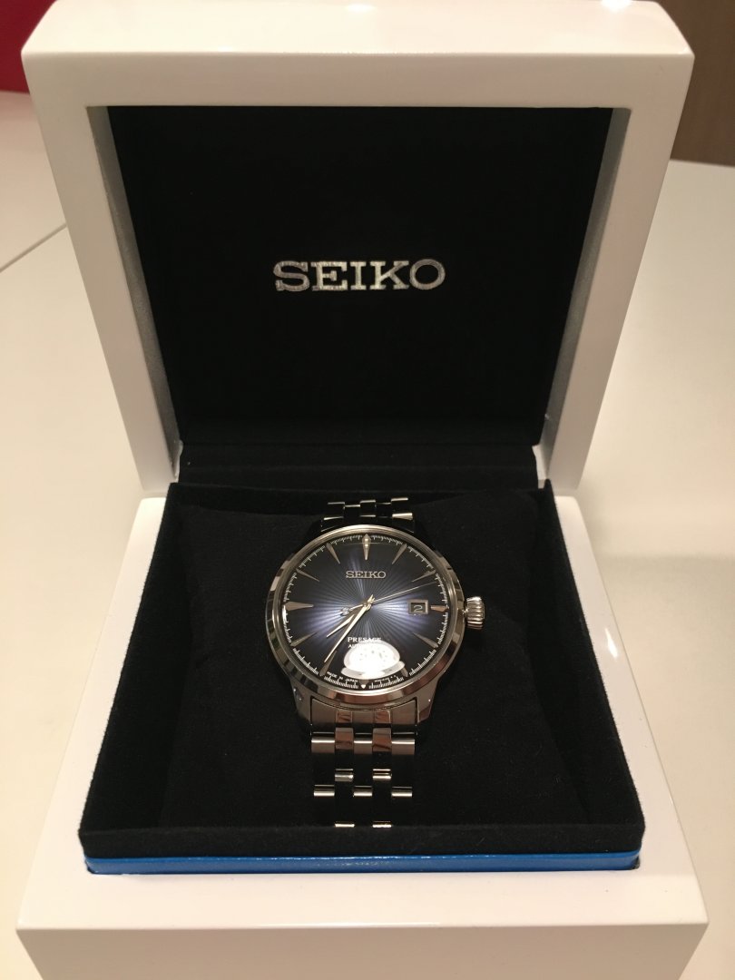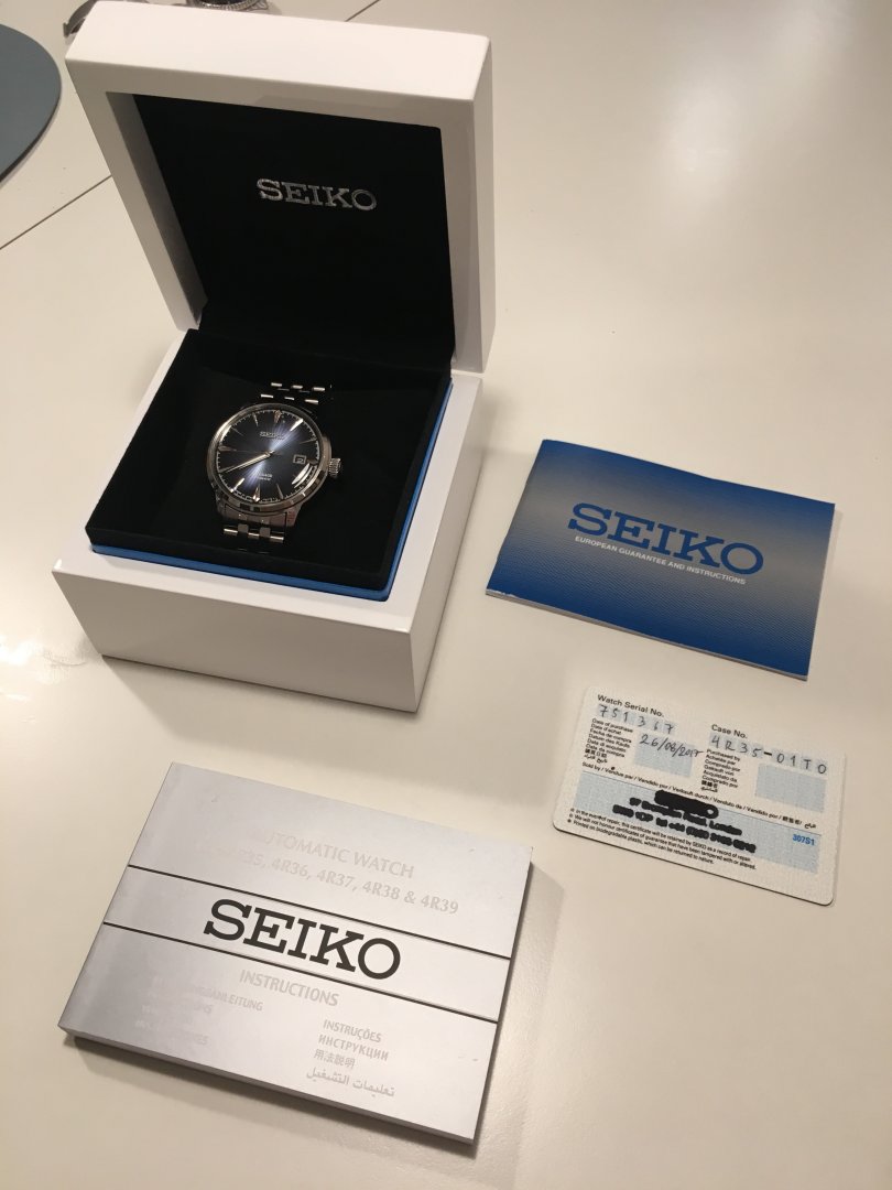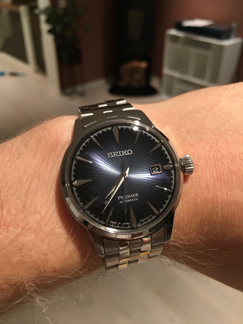 Lite brukt og nesten ny Seiko Presage Cocktail Time «Blue Moon». Kjøpt hos Seiko Flagship Store i London 28. august 2017. Brukt i rotasjon med andre ur i en mnd, og jeg klarer ikke å se noen bruksmerker på den av betydning.
