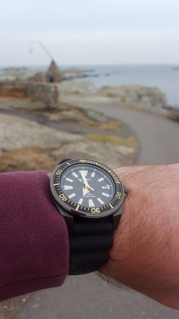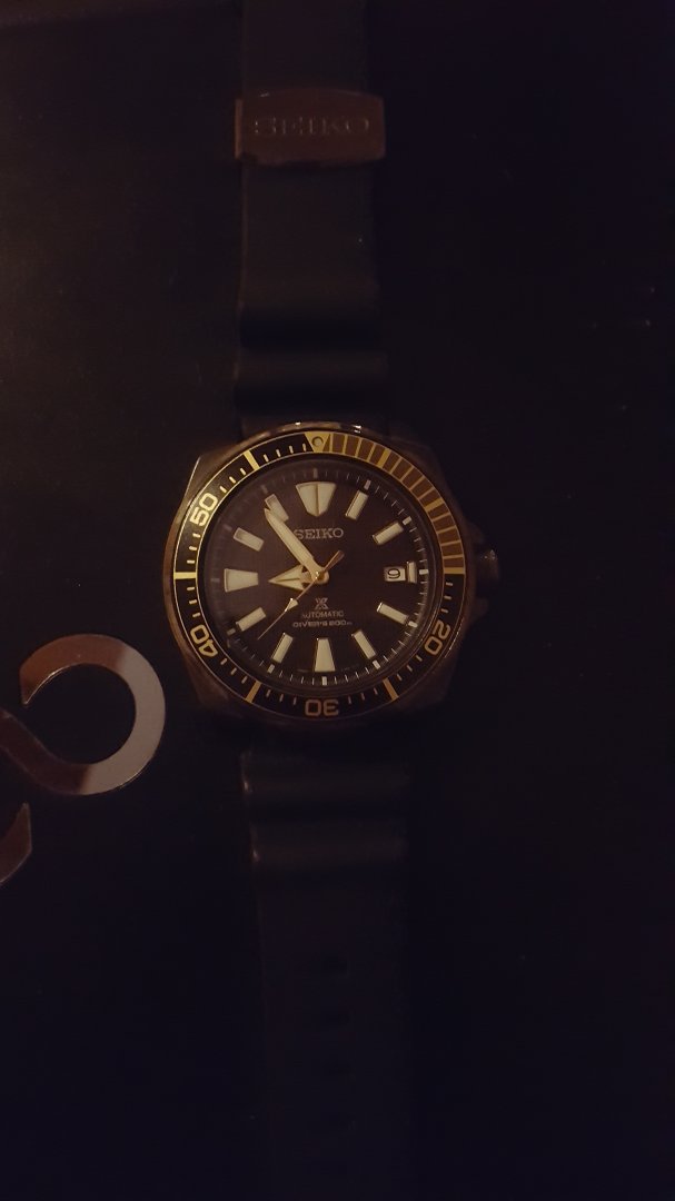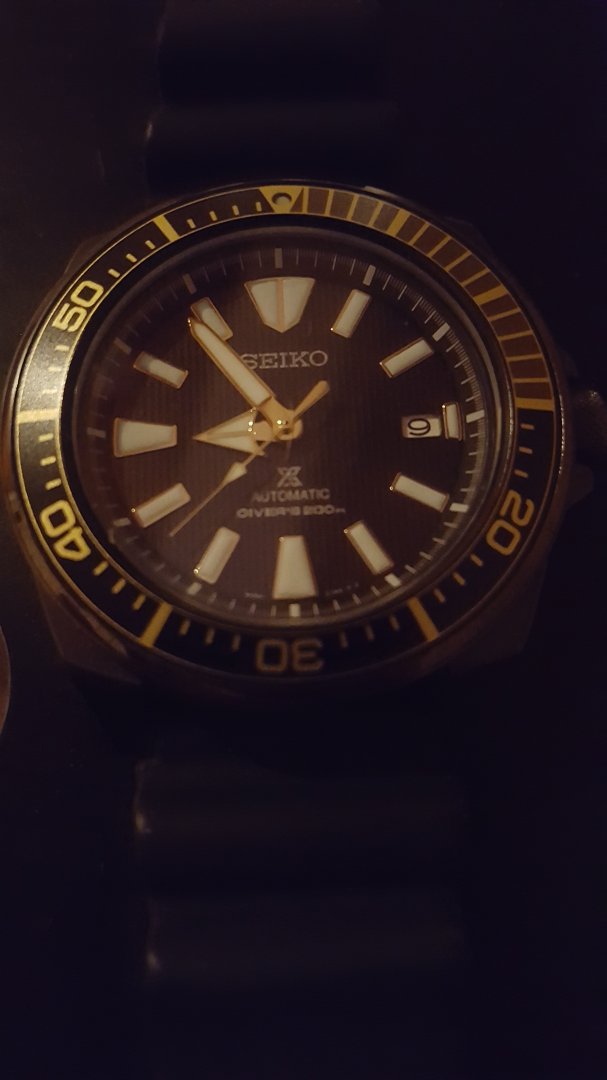 Dette er en kjempe tøff diver fra seiko, klokken er svart med gullfarge detaljer på bezel. Klokken blir ikke mye brukt, derfor den selges. Brukt den i rotasjon med andre klokker, ingen merker eller hakk, hvis du leter finner du kanskje noen obligatoriske hairlines. I meget pen stand, holder tiden godt.