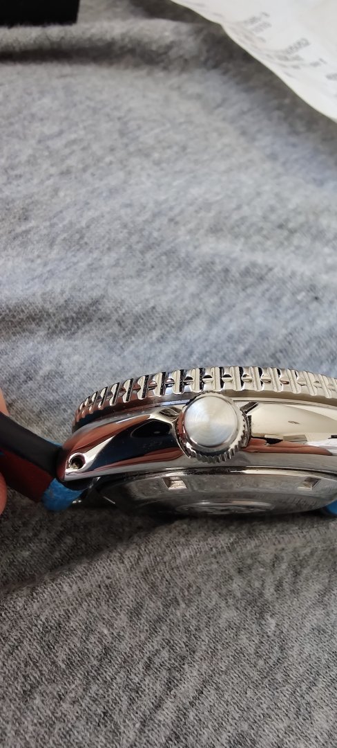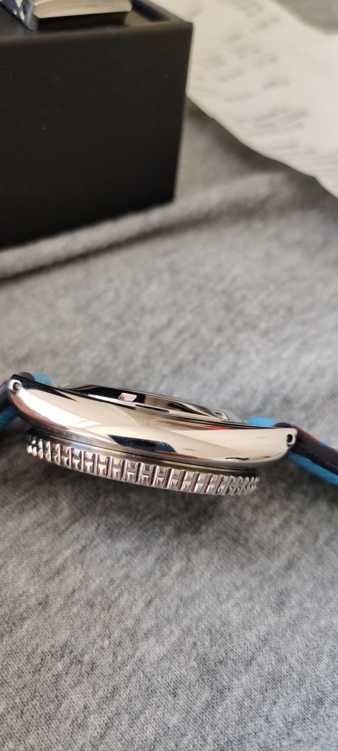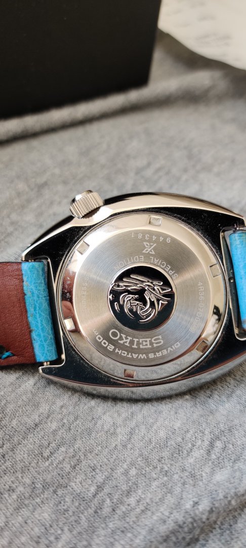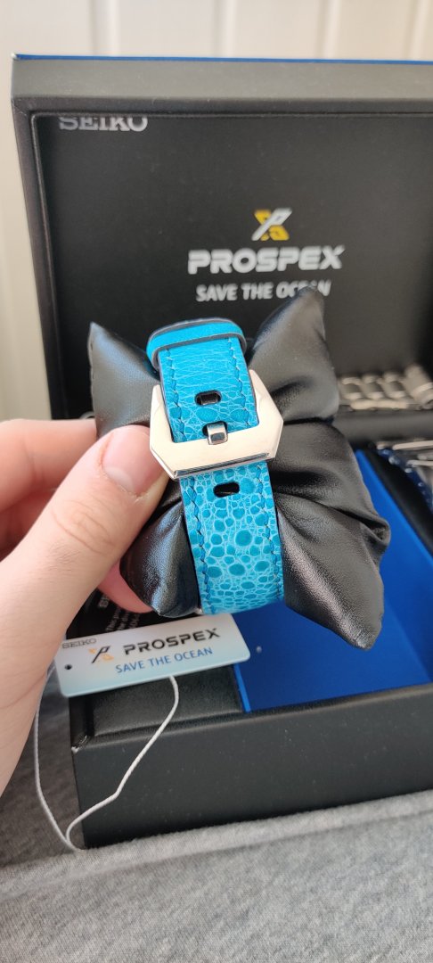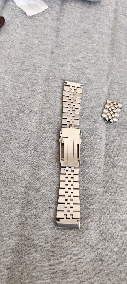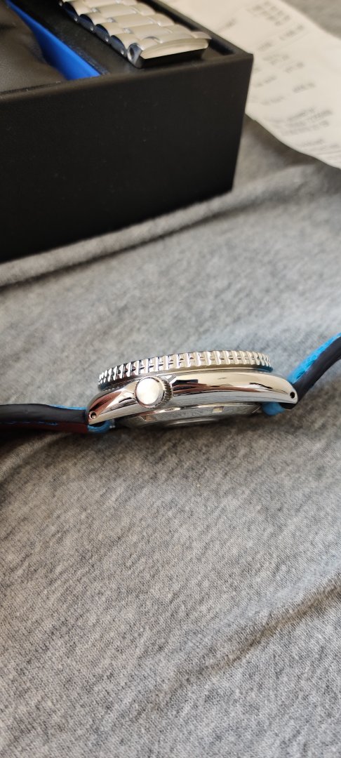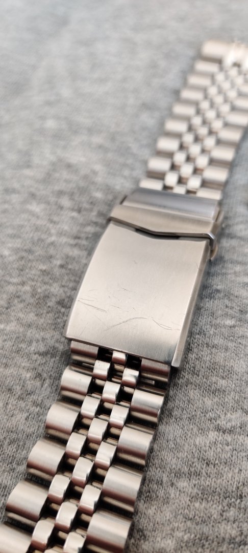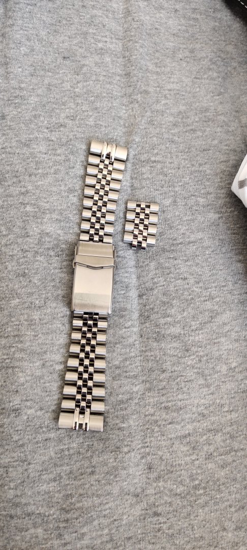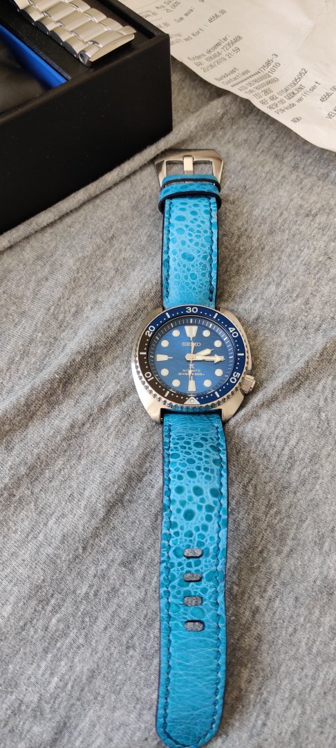 Hva følger med? - Håndsydd reim med froskemotiv i blå som jeg kjøpte fra en på klokkeriet, Strapcode angus jubilee med kurvede, solide endeledd og original lenke. Den originale lenka mangler en pin og medhørende sleeve som jeg klarte å miste ved en lenkejustering (i mitt forsvar er de ganske irriterende å justere).