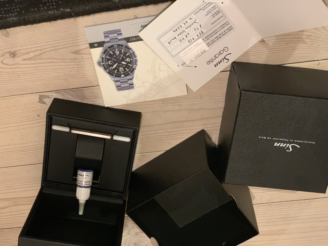 Komplett med boks og papirer.