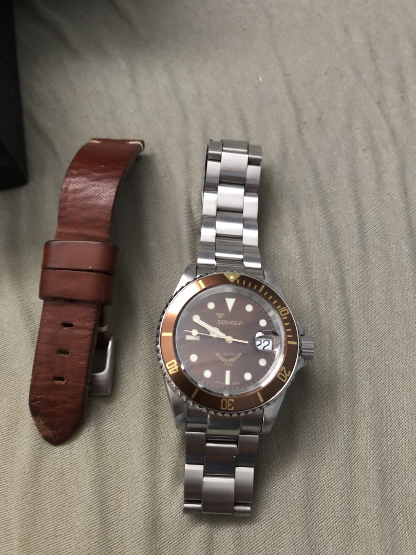 316L Stainless steel with brown bezel insert. 120 clicks.