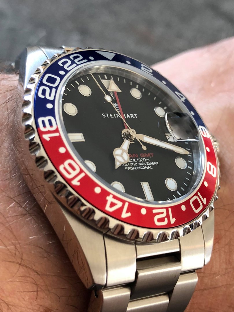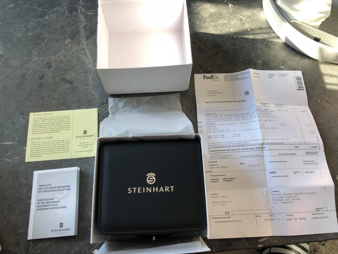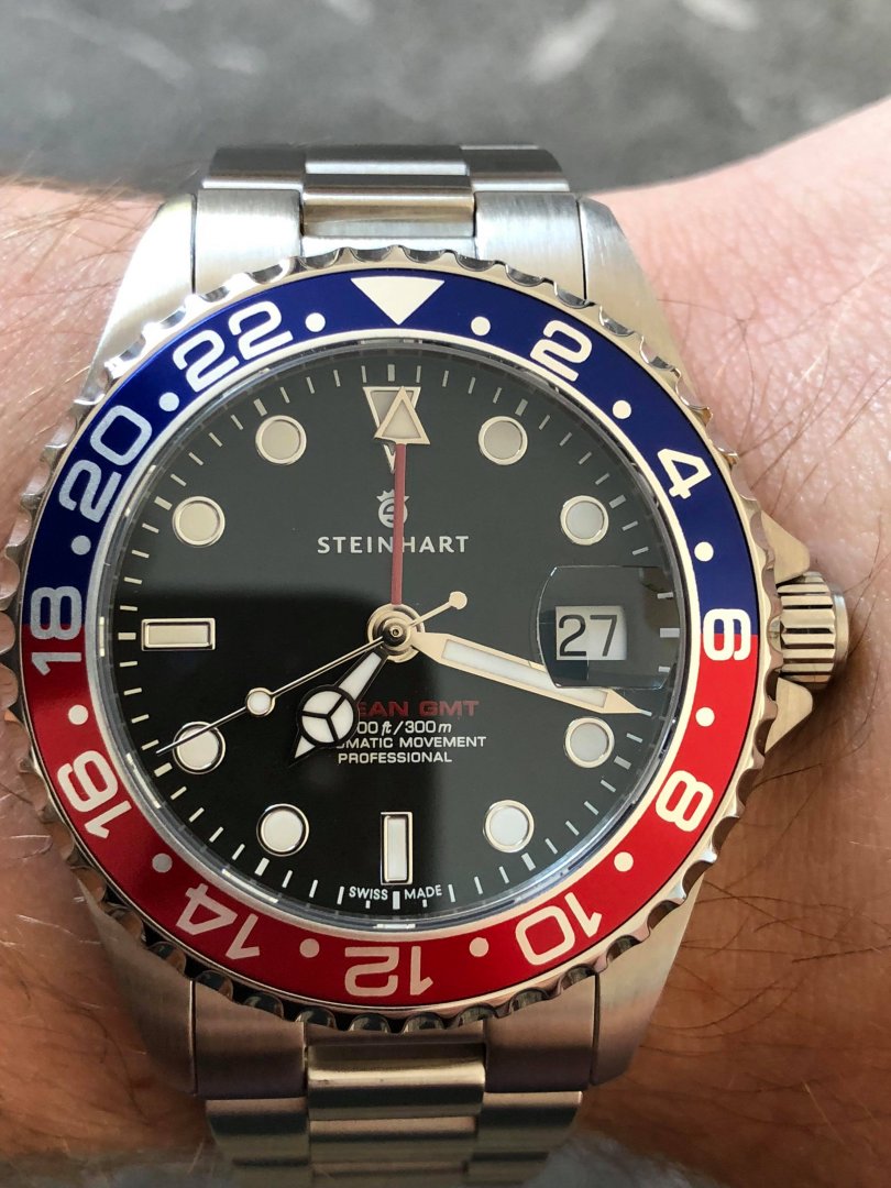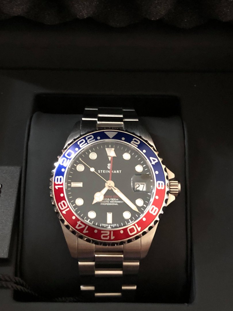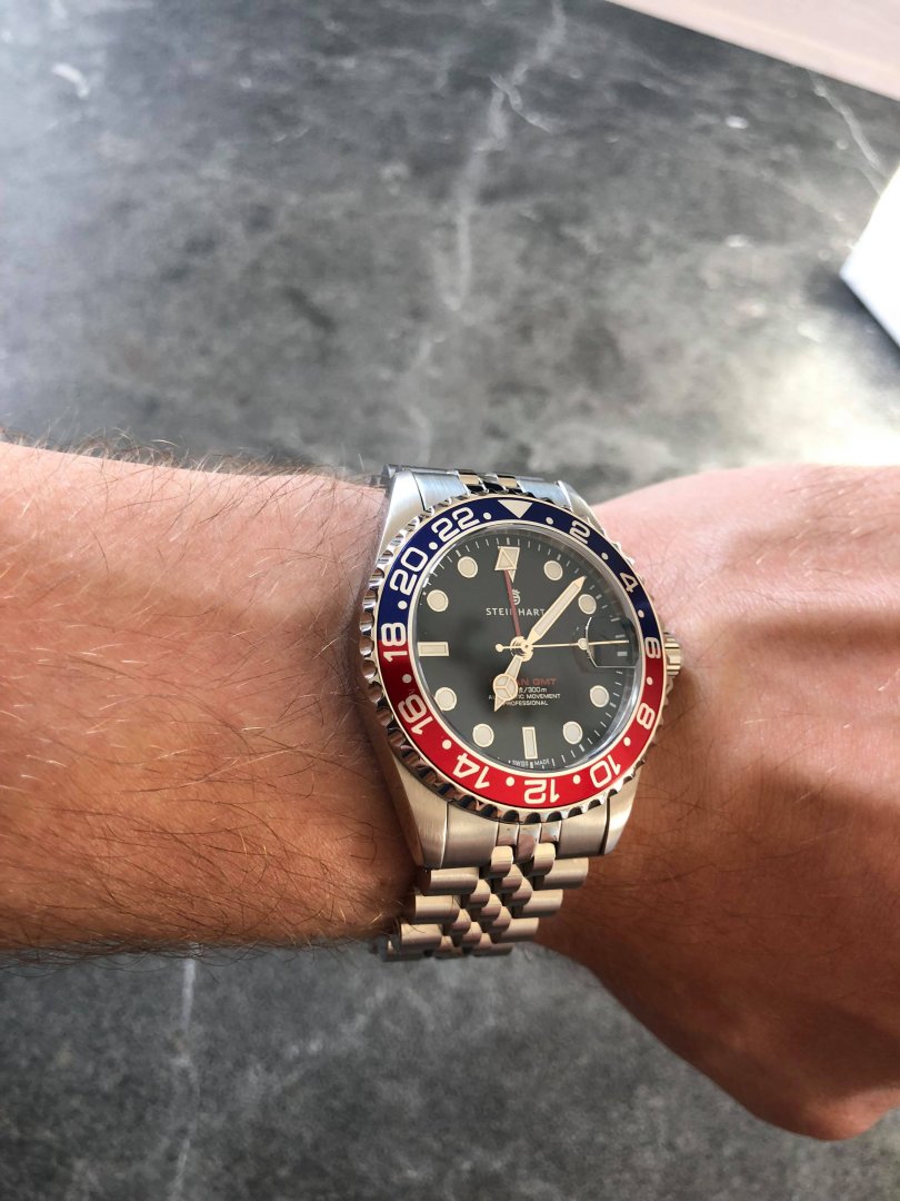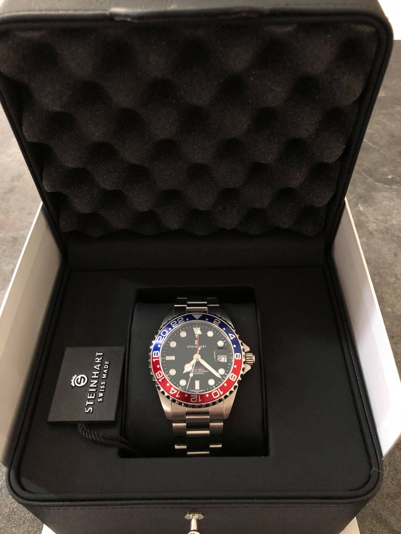 Selger min nydelige Steinhart GMT-OCEAN One 39 blue-red, da jeg skal selge unna et par klokker for å finansiere en ny. Denne kjøpte jeg helt ny fra Steinhart sine hjemmesider, og kom i posten for 2 uker siden. Klokken er brukt 6-8 ganger i rullering med en annen.