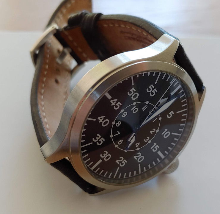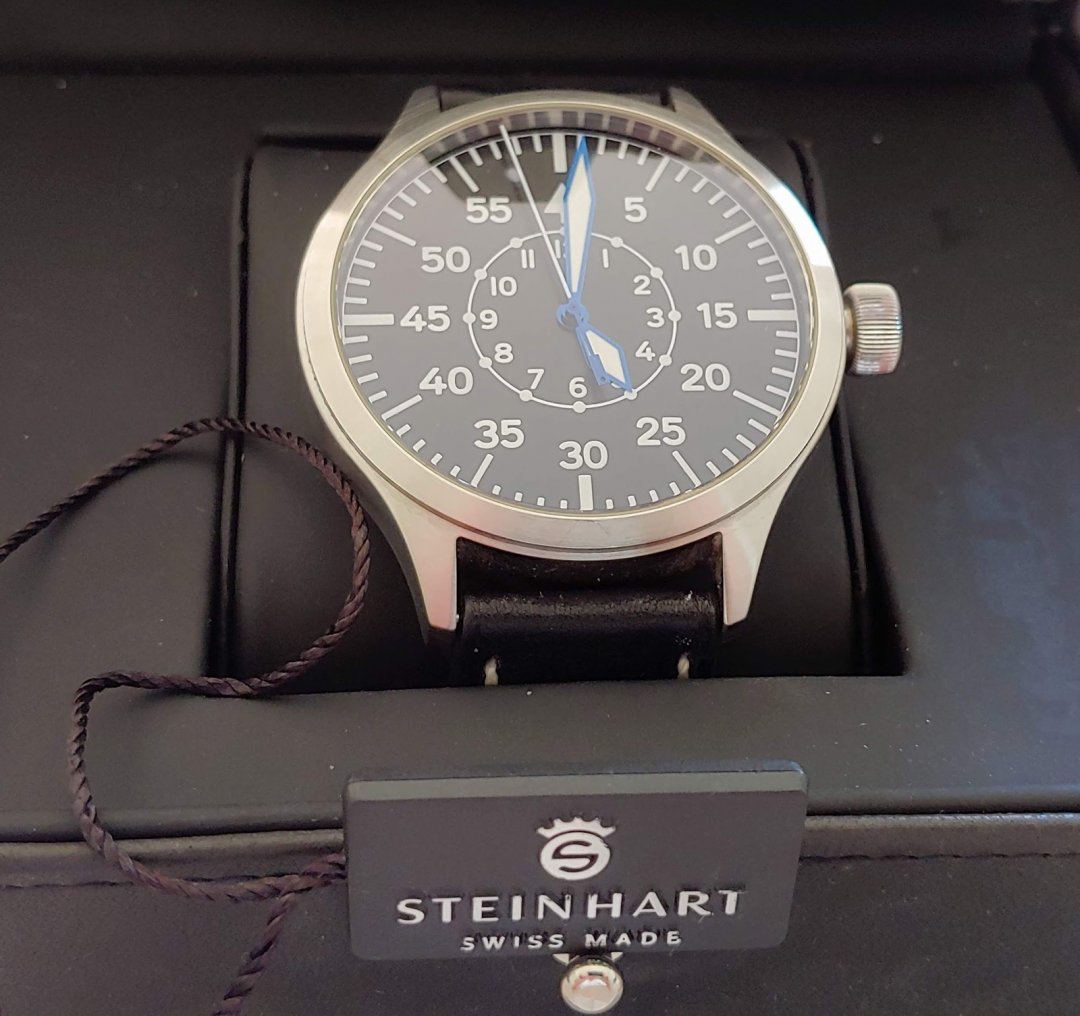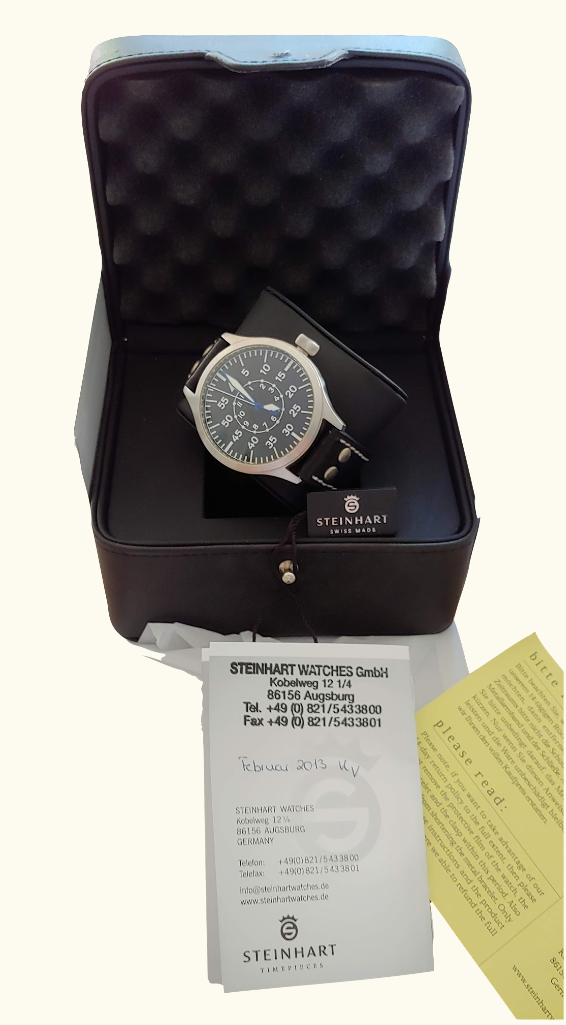Dial: black Crystal: Sapphire domed interior non-reflecting Bezel: stainless steel Indices: Superluminova white C1 Lug width: 22 mm WaterRes: limited water resistant, no swimming or shower Strap: Steinhart Pilot Strap Buckle: OEM 22mm stainless steel screwed bolt clasp