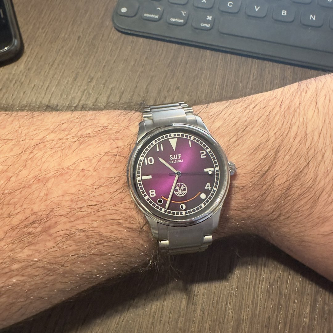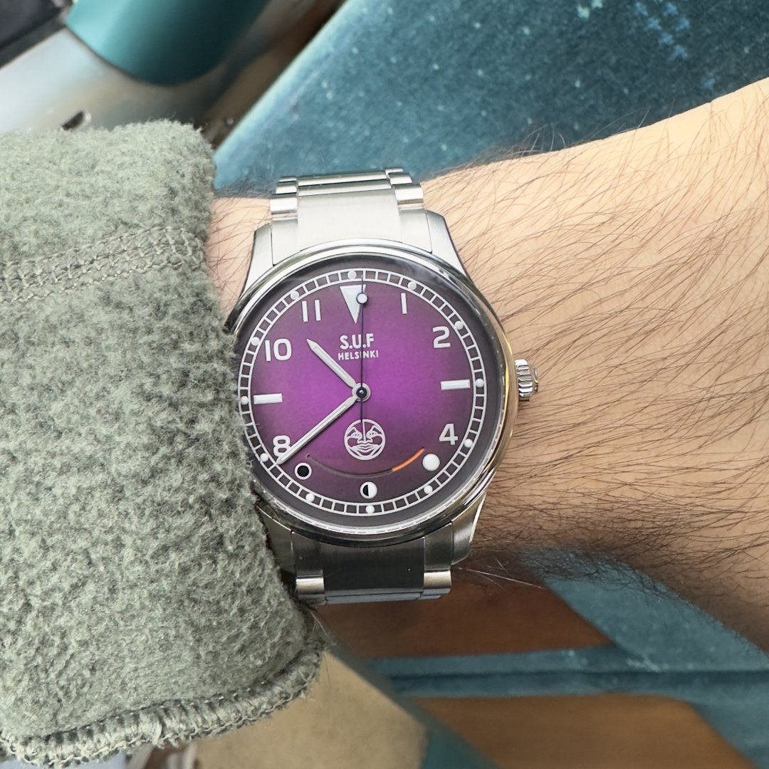Selger her min SUF Kaaos 180 med en lekker candy lilla skive og månefasevisning. Den har raskt blitt en av mine favorittklokker men må dessverre vike grunnet boligkostnader. Solgt i 2023 og er en av 20 klokker i denne konfigurasjonen. Nypris ligger på rundt 55.000,- etter MVA. Kommer med lærreim, Marina Nationale reim og medhørende lenke fra SUF som selges separat til 500€