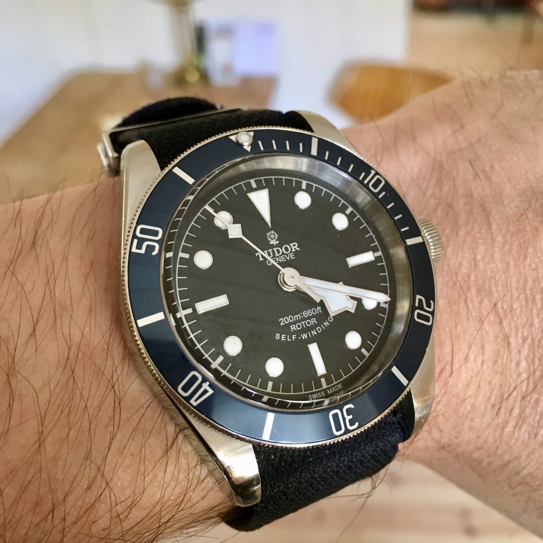 Selger en Black Bay Blue. Klokken kommer på original, godt brukt NATO og original blå lærrem med Tudor-spenne. Sertifikatet er stemplet hos italiensk AD november 2014, jeg kjøpte den av GG her på sonen nå i vinter. Klokken bærer preg av daglig bruk, og har en del hairlines og småriper som nok lett lar seg polere bort, samt noen små hakk i kantene på baksiden. To små merker på bezelinsert, ellers fin.