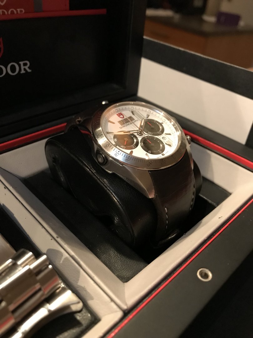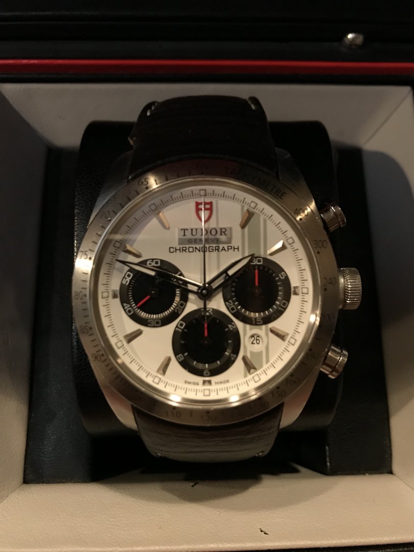 Selger en flott Tudor Fastrider 42000 fra 2013 med nydelig panda skive, og mørk brun skinnreim med foldelås. Klokken er brukt men framstår som i veldig god stand.