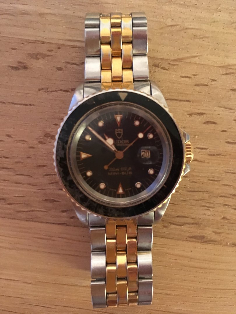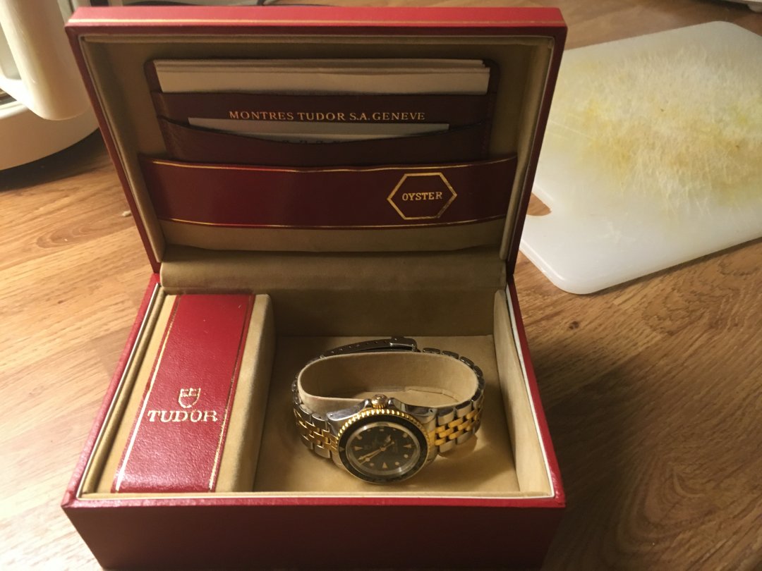 Tudor minisub 1987 selges for Nok.14000,- 33mm diameter Original eske og dokumenter.Kjøpt ny av meg hos Torres (Rolex forhandler) i Lisboa 1987. Ikke brukt de siste15 år. endel bruksmerker.Klokken går.