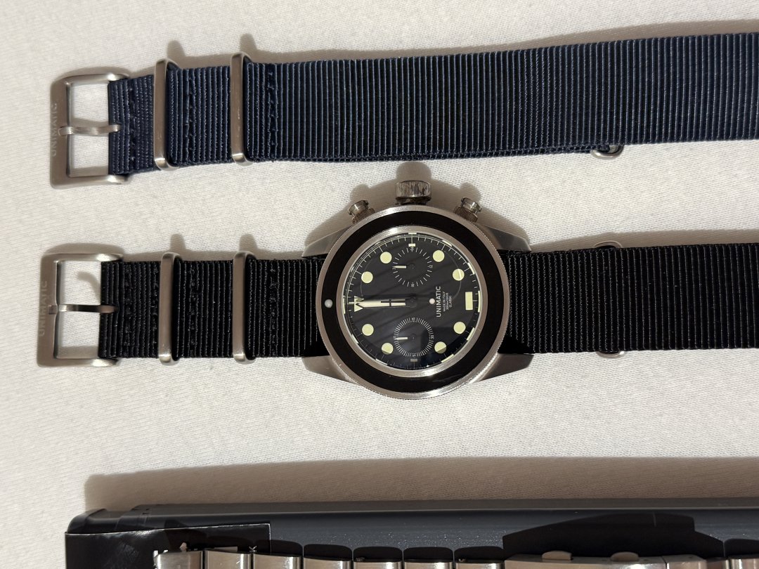 Meget fin og pent brukt Modello 3 Chrono. Kommer med en del ekstra utstyr: brukt stållenke ($150), ubrukt stållenke, og blå nato-reim ($40). Samlet verdi over 10k.