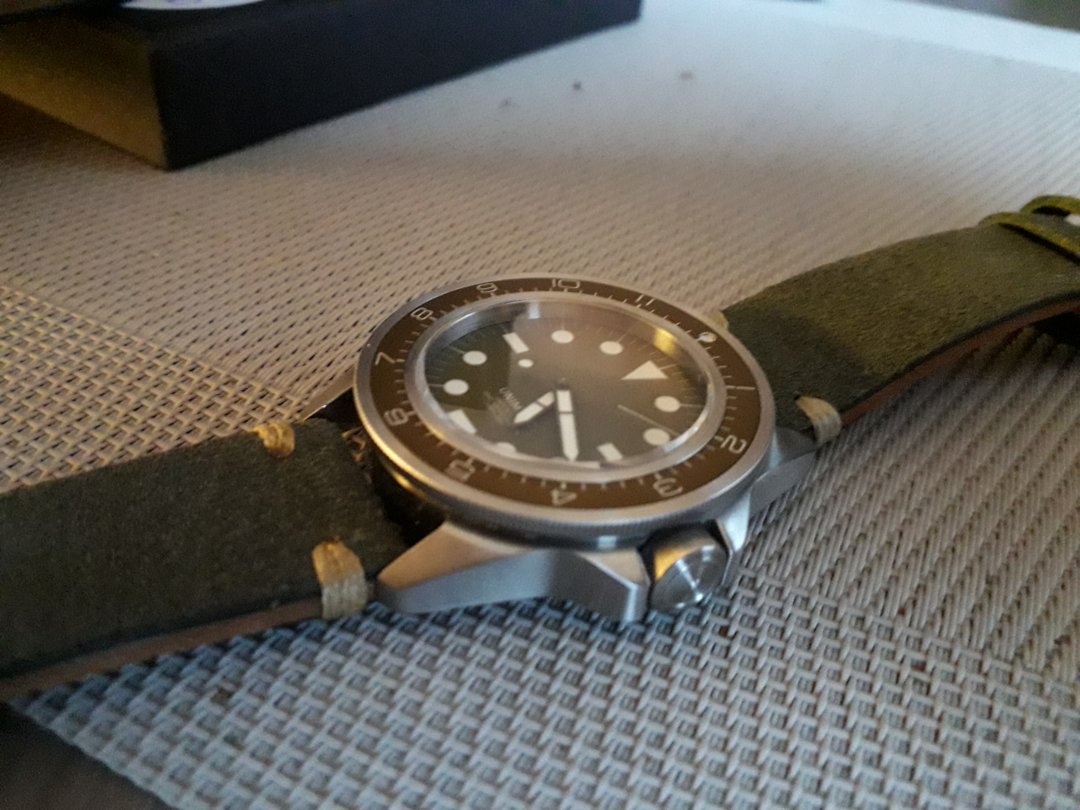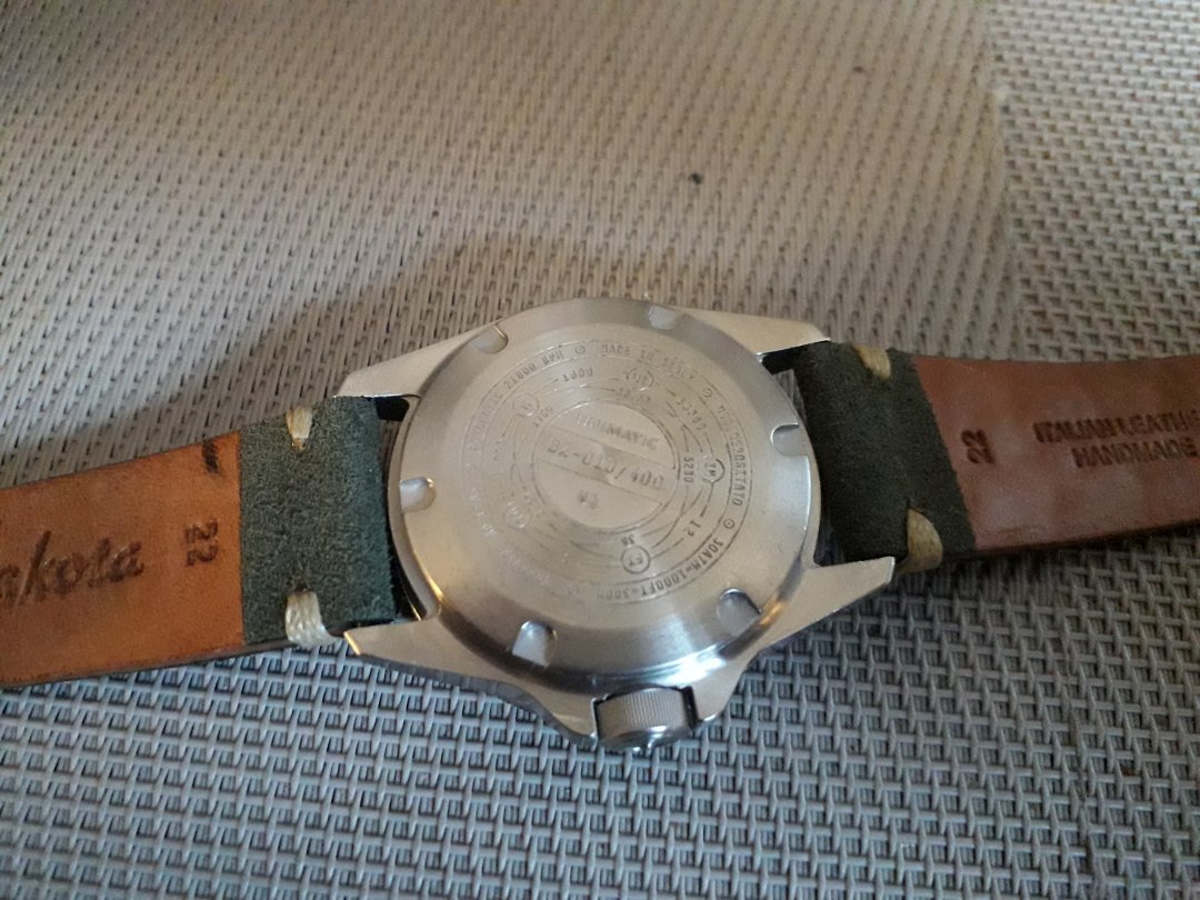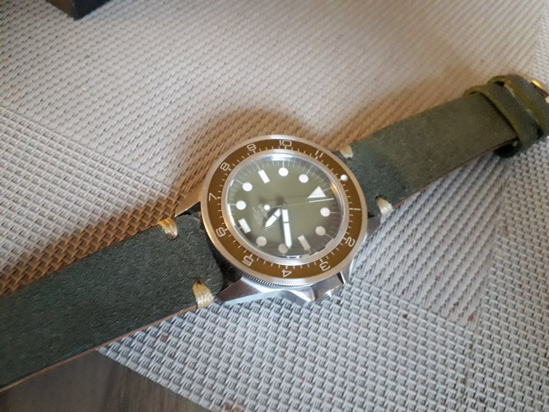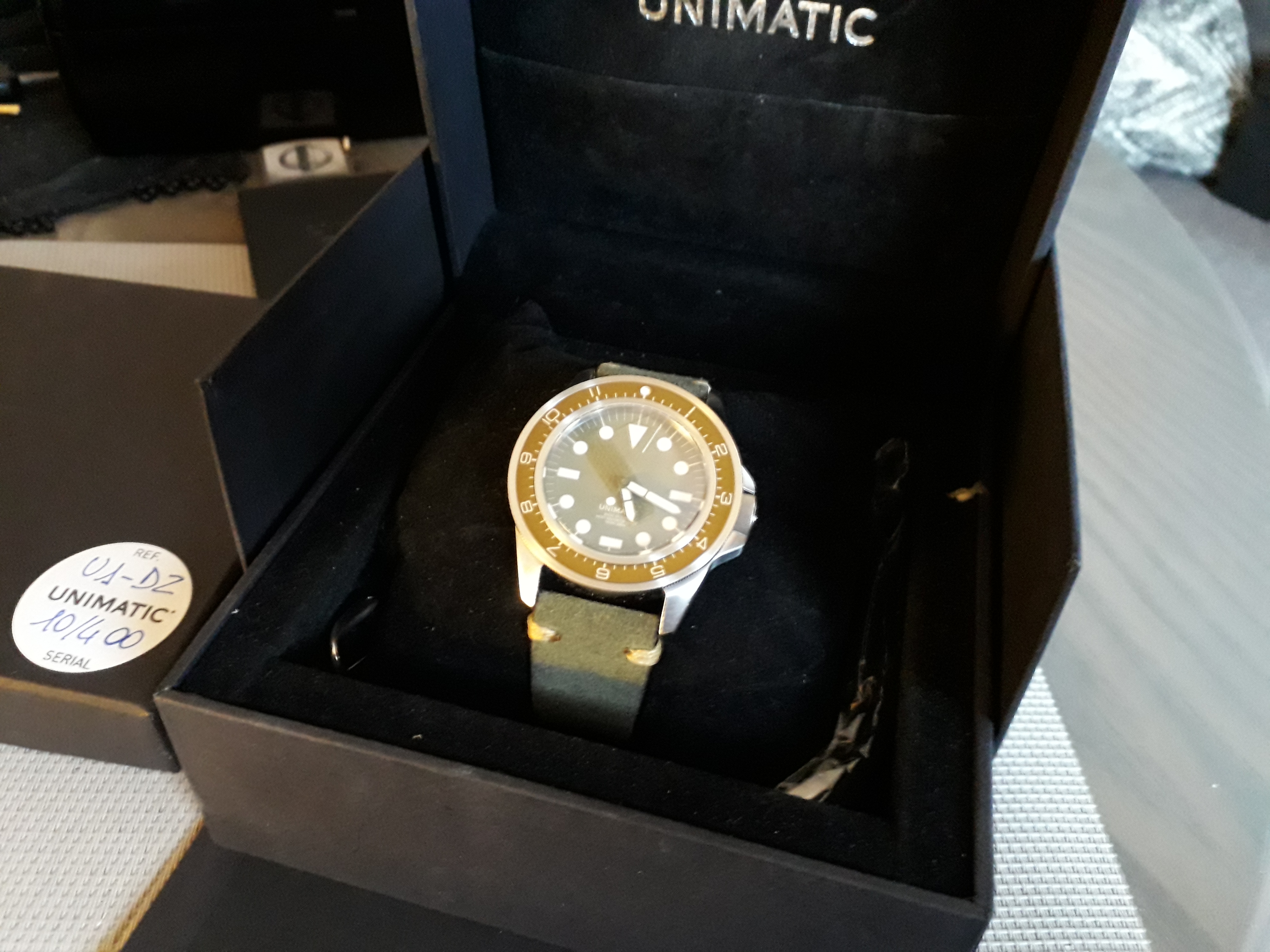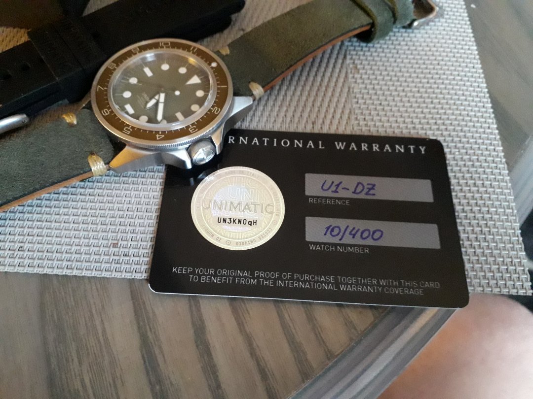 Meget pent brukt Unimatic U1-DZ made in Italy nr10 av 400 skikkelig solid tool watch som tåler bruk 41,5mm pluss krone 22mm reimfeste wr300m sitter på en hånd lagd italiensk skinn reim som matcher klokkas oliven grønne skive og ubrukt original gummireim følger med .