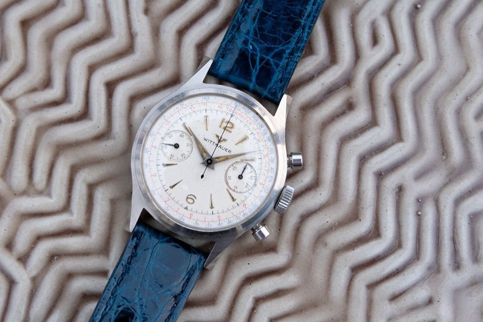 Selger min Wittnauer referanse 3265 kronograf. Denne modellen er fra midten av 60-tallet og i svært god stand. Alt er originalt, klokken er upolert, skiven er ikke restaurert. Den fikk service i November 2019 (iflg forrige eier, det finnes ingen dokumentasjon), klokken holder tiden godt på armen, men er ikke målt nøyaktig. Kronografen resettes som den skal. Klokken måler 36mm og er huset i stålkasse. Du kan se at den originale poleringen fortsatt er helt intakt på lugsene. Urverket er Wittnauer caliber 14W, basert på Venus 188. Kassen har vanlige bruksmerker og litt riper på baklokket, men ingen store sår. Klokken kommer på en blå skinnrem fra Morellato.