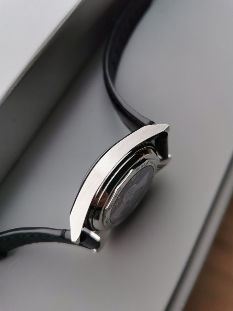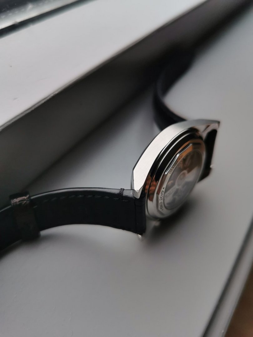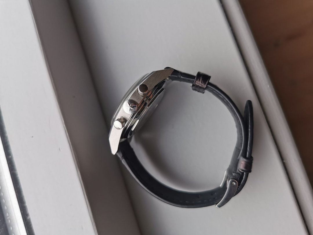 Klokken er brukt og hairlines finnes. Det er en liten ding på lug nederst til venstre og litt små merker fra reimbytte. Alt av merker er på undersiden og på topp er den tilnærmet mint.