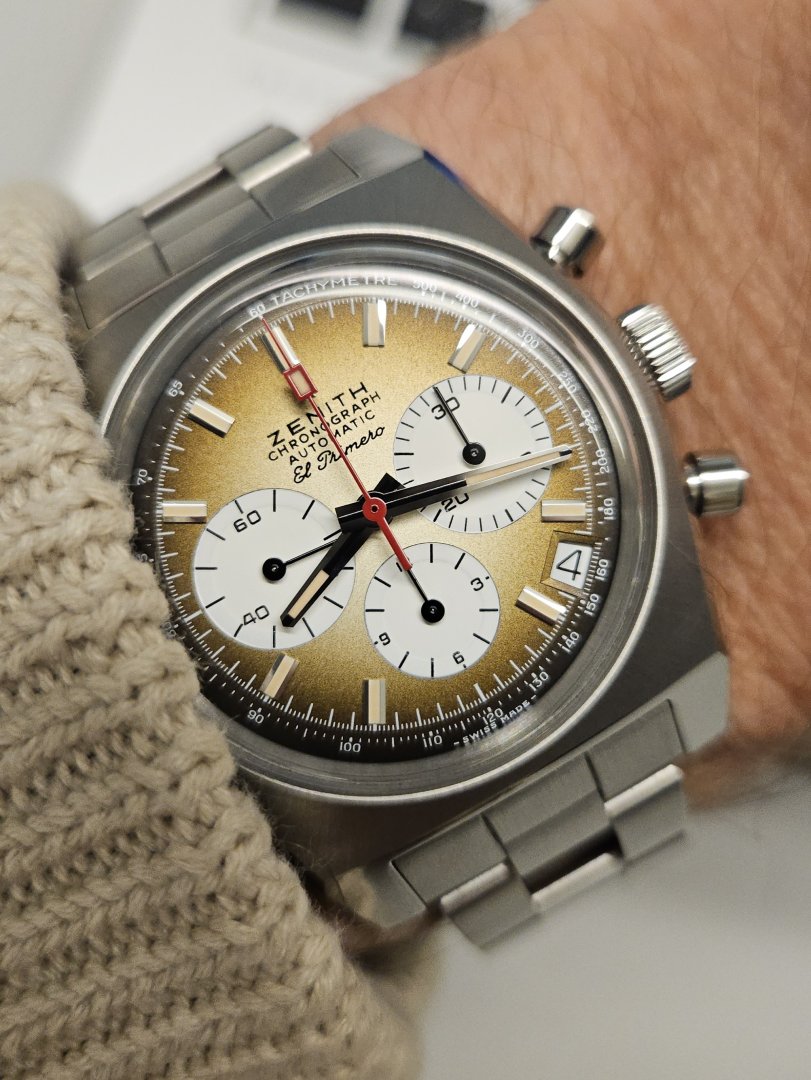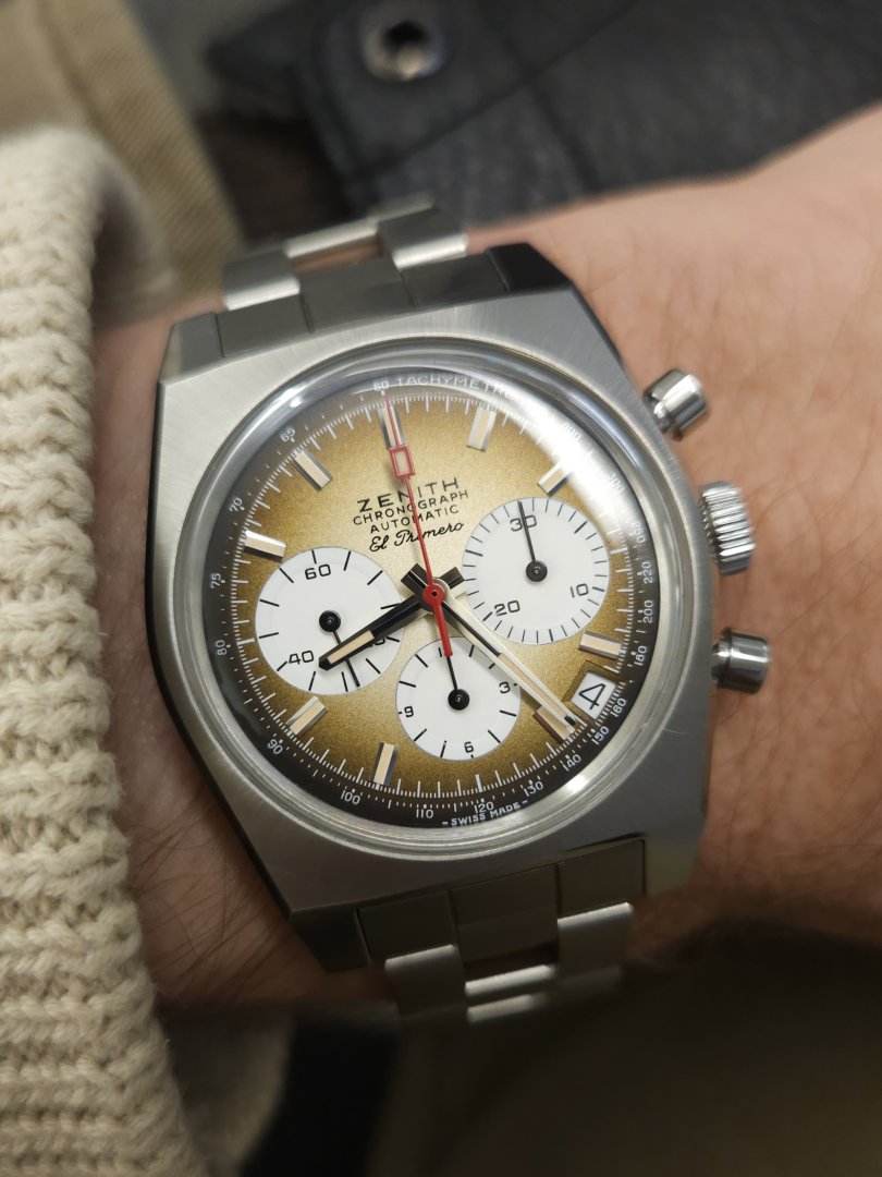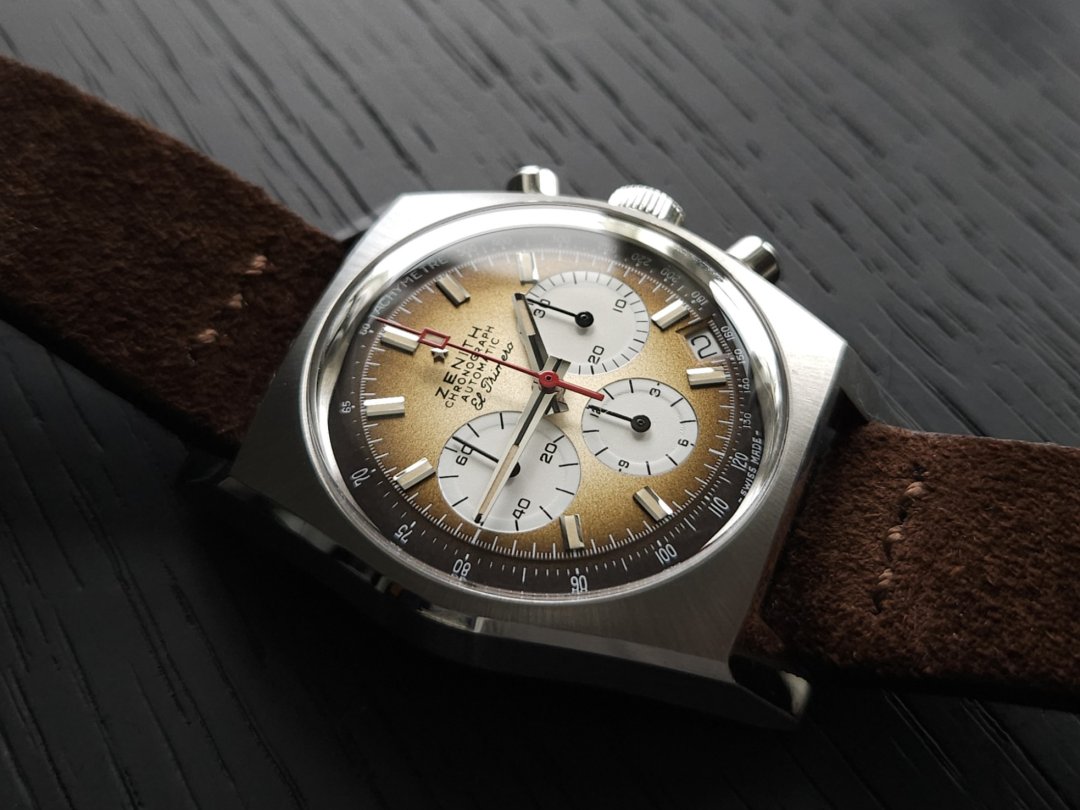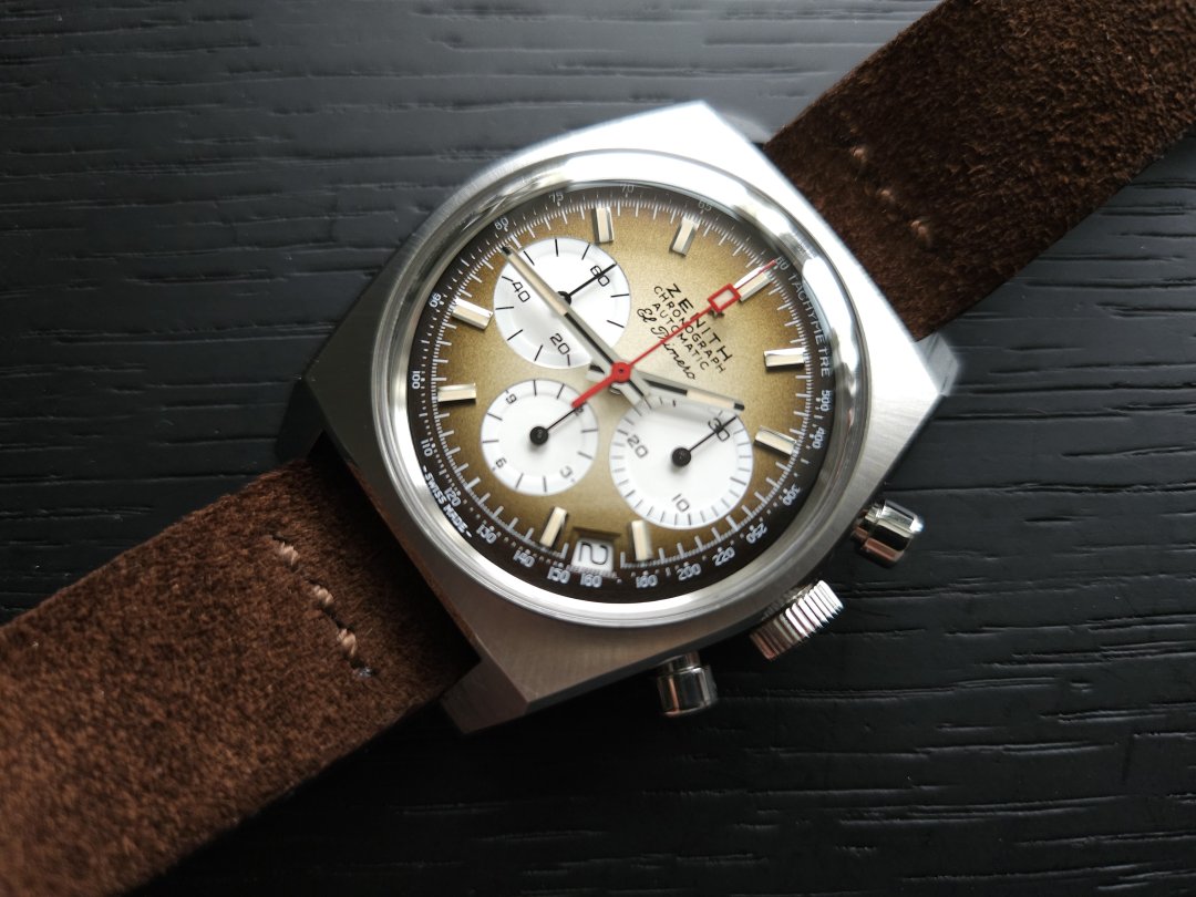 Herlig retro kronograf med El Primero 400 verk i en 37mm kasse. Fantastisk skive som veksler fra lys latté til mørk brun.