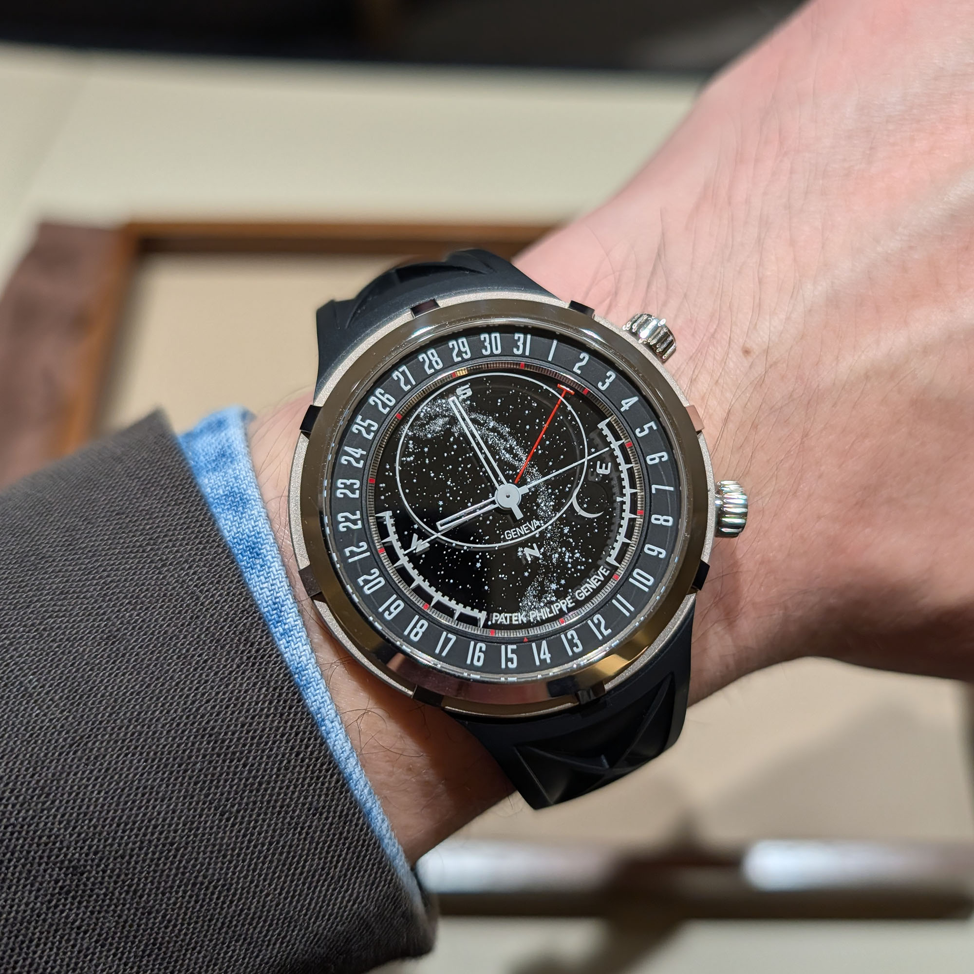 Fra én overraskelse til en annen – den nye ref. 6105G så jeg virkelig ikke komme. Den nye Celestial-modellen gjengir ikke bare stjernehimmelen slik den ses fra Genève, men er også utstyrt med indikatorer for soloppgang og solnedgang, og korreksjon for sommer- og vintertid. En teknisk komplisert øvelse som Patek virkelig mestrer.
