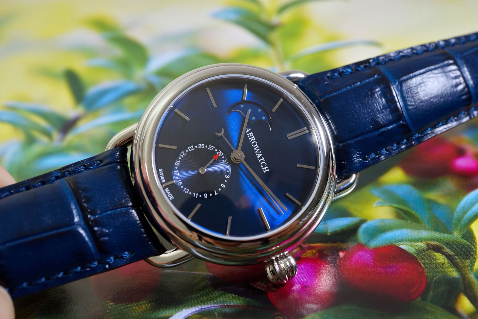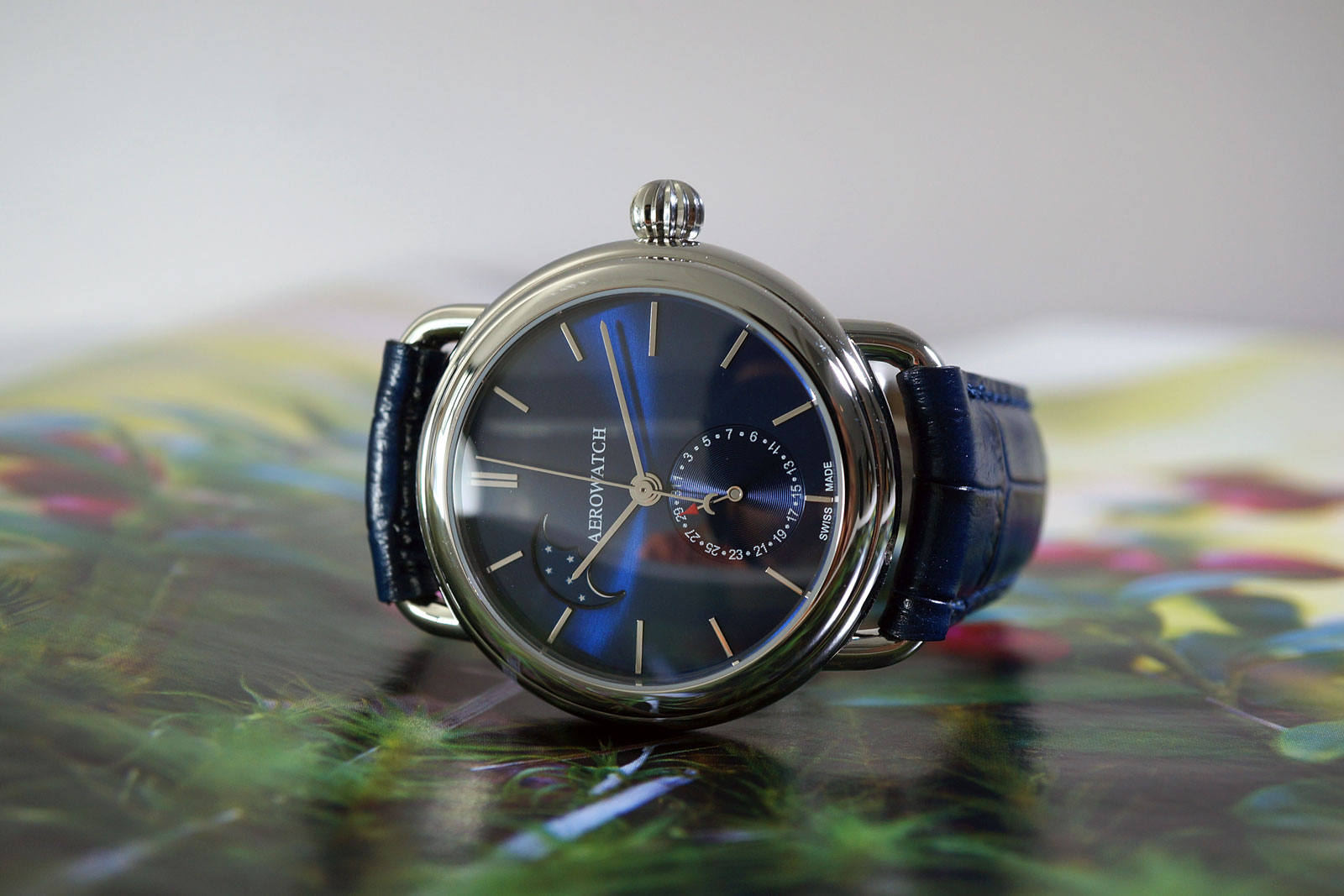 Både blått og månefaseindikator er av mange ansett som en av de store klokketrendene for øyeblikket, og Aerowatch 1942 Moon Phase bør være en god kandidat for kjøpere på utkikk etter et blått innslag i samlingen. Jeg sier «samlingen», for 1942 Moon Phase er med sine spesielle detaljer og iøynefallende blåfarge trolig mest aktuell for de som allerede har både 1 og 2 eller flere ur fra før, fremfor førstegangskjøperen.