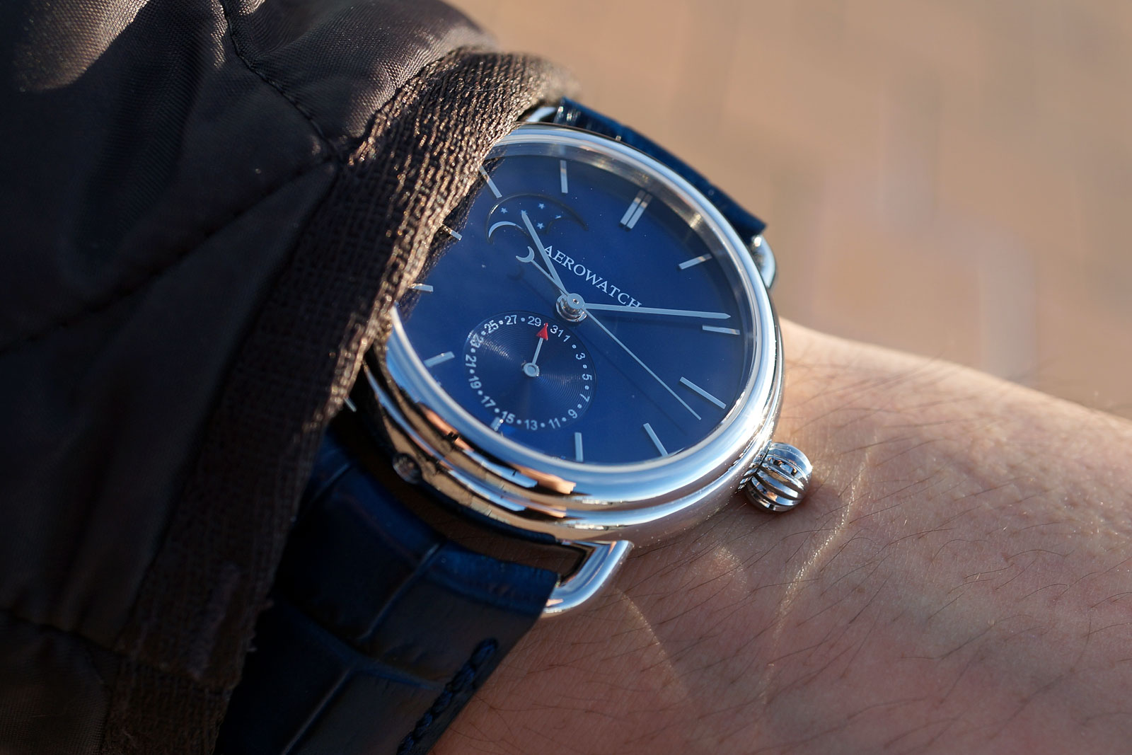 Modellen vi har hatt på håndleddet i nesten én uke, er en Aerowatch 1942 Moon Phase. Denne er en del av Aerowatch sin 1942-kolleksjon, som består av merkets mest klassisk-inspirerte urmodeller.