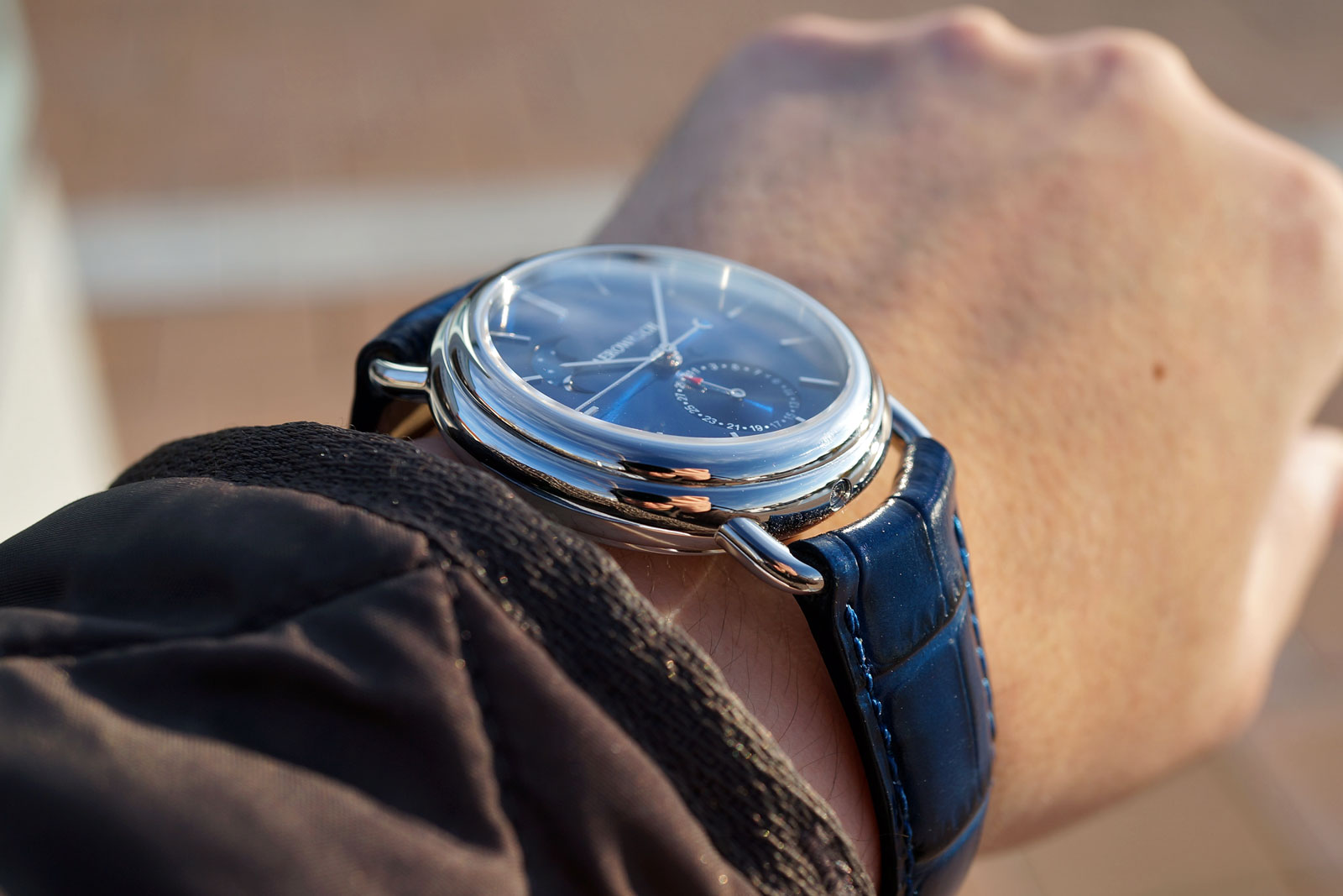 1942 Moon Phase er tilgjengelig i flere varianter med ulik urskive og visere. Eksemplaret Tidssonen har lånt, er imidlertid utstyrt med en dyp blå urskive med enkle rhodinerte indekser og visere. Blåfargen er notorisk vanskelig å fange på bilder, men urskiven høstet flere lovord fra de som så den med egne øyne under testperioden. Fargen har en tendens til å skifte avhengig av lysforhold, og varierer fra nesten svart til ulike toner av blått.