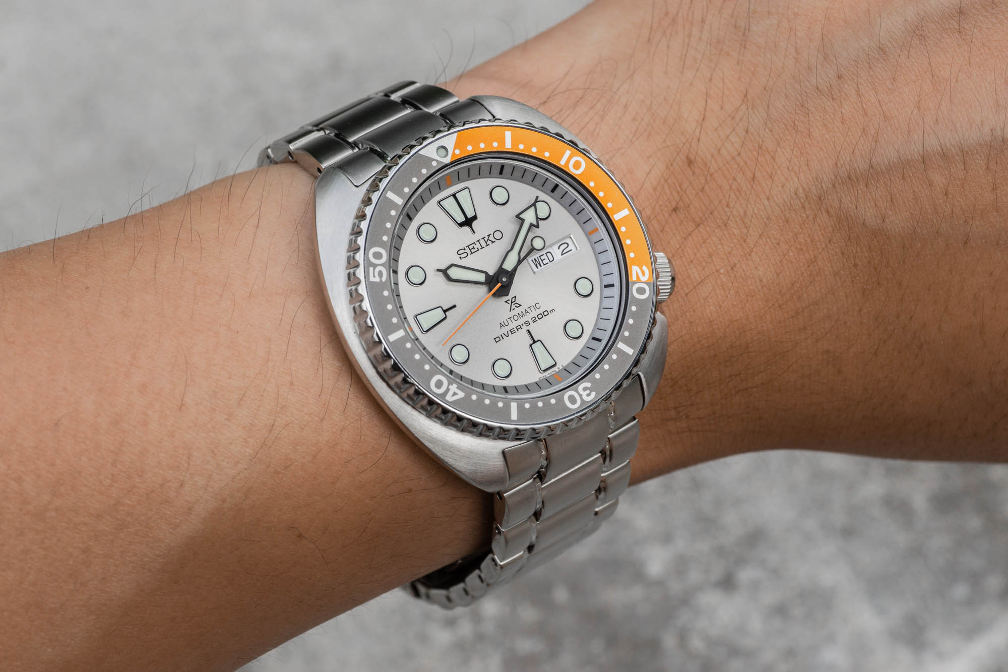 Spesifikasjonsmessig har kassen fortsatt en diameter på 45 millimeter, og er fortsatt utført i rustfritt i stål. Et roterbart dykkerbezel omgir Hardlex-glasset, og med skrudd krone og fast baklokk, er klokken vannresistent til 200 meter. På innsiden tikker Seikos egenproduserte kaliber 4R36. Det selvopptrekkende urverket har en gangreserve på 41 timer.
