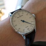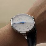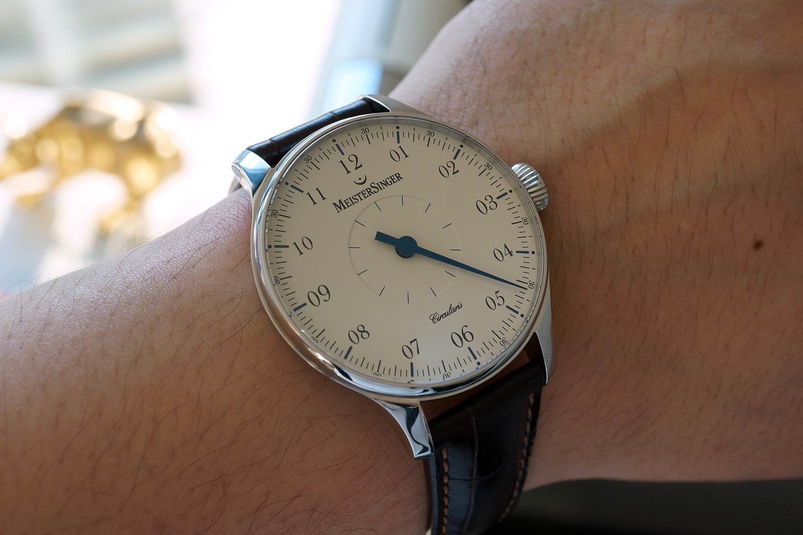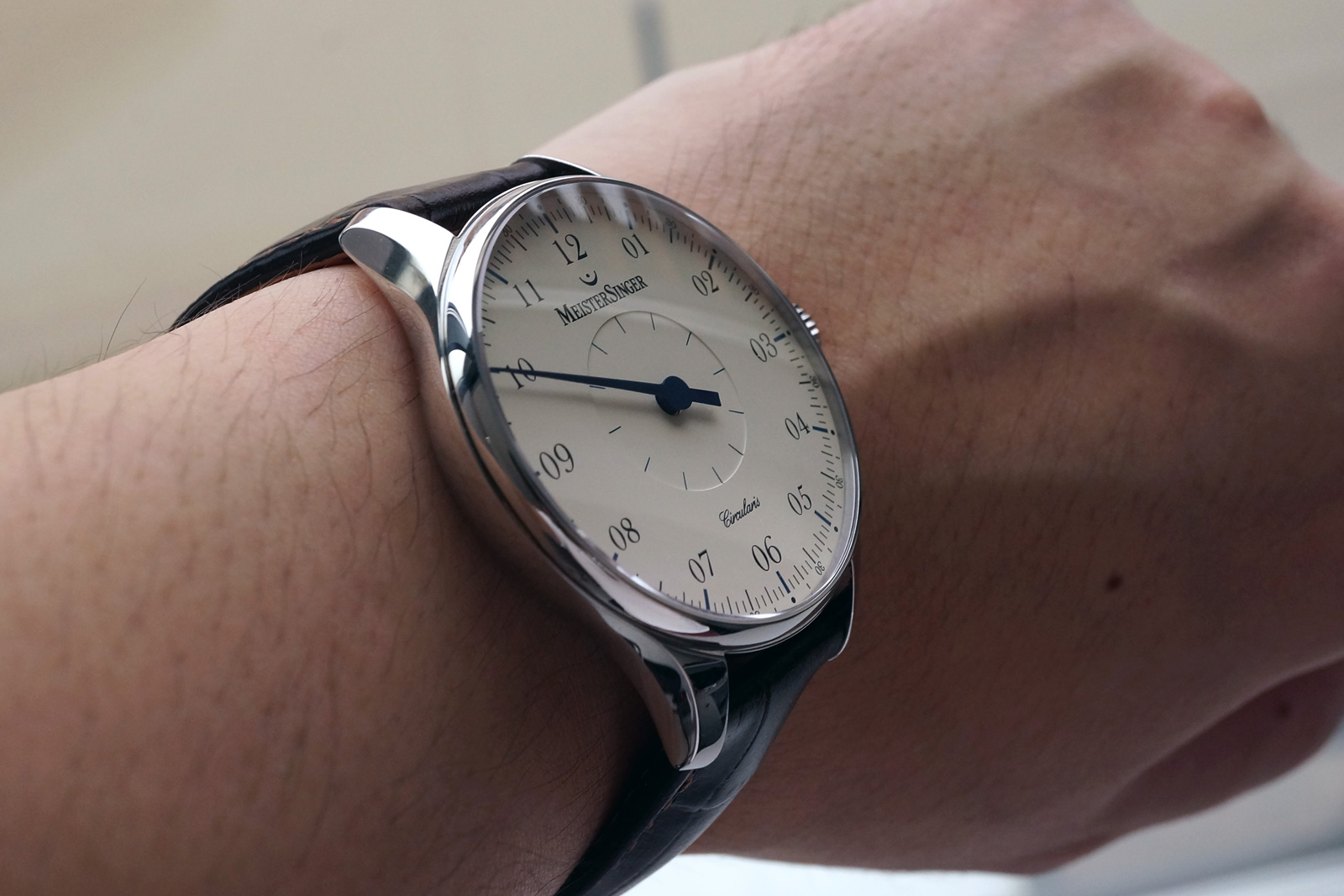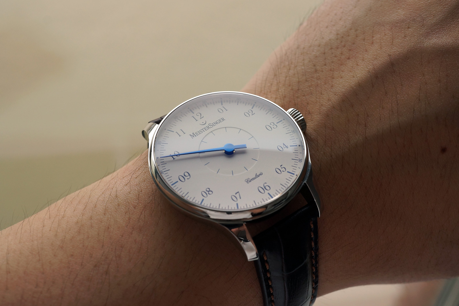 I front ser vi straks den velkjente og enslige MeisterSinger-viseren i blånert drakt. De færreste av oss bruker ur med kun én viser daglig, men tilvenningsperioden er langt kortere enn man skulle tro. Å foreta tidsavlesning på en MeisterSinger er egentlig temmelig intuitivt.