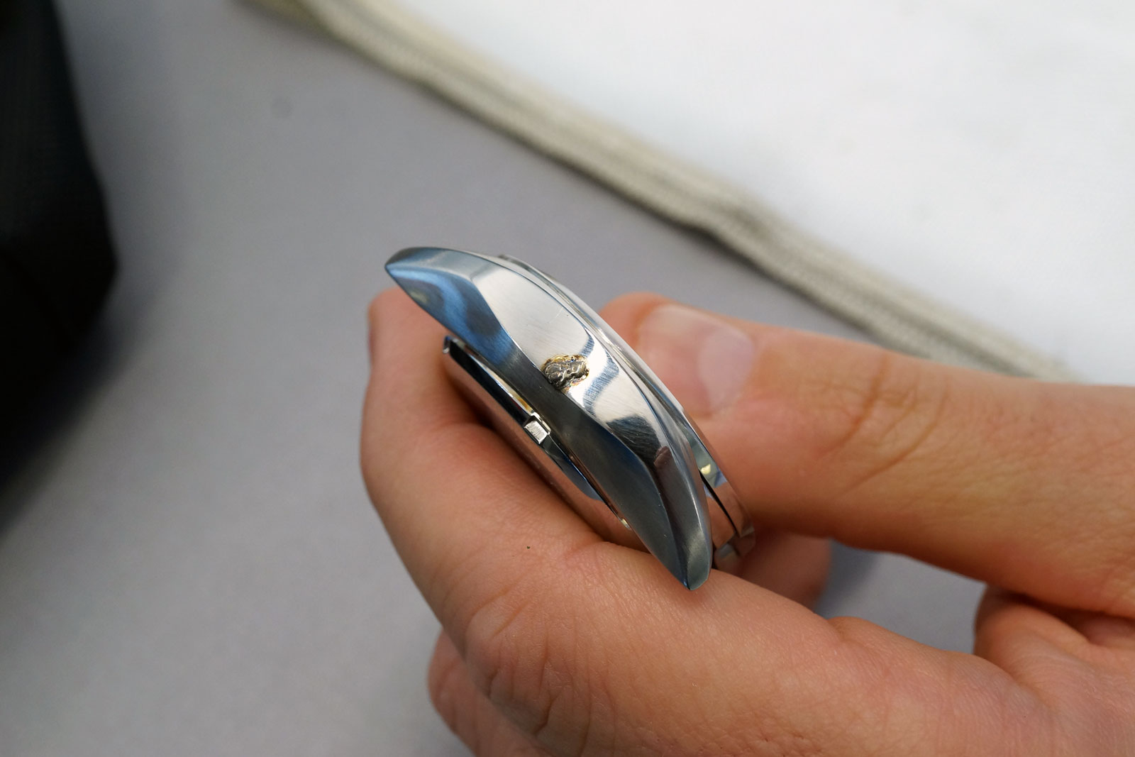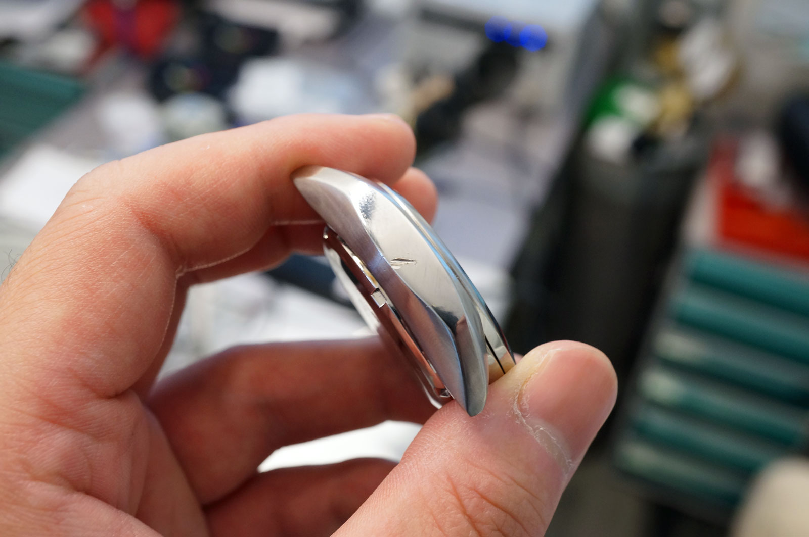 Urmaker Kjartan foretok gladelig en liten demonstrasjon av deres PUK buesveisemaskin for å vise hvordan konseptet fungerer i praksis. Ordinært er dette en langt mer tidkrevende prosess for å oppnå best mulig finish, men selv under den relativt korte demonstrasjonen er det umulig å ikke la seg imponere over resultatet. Som bildene viser ble en urkasse påført nokså dype sår som etter behandling var så og si umulige å skimte med det blotte øye.