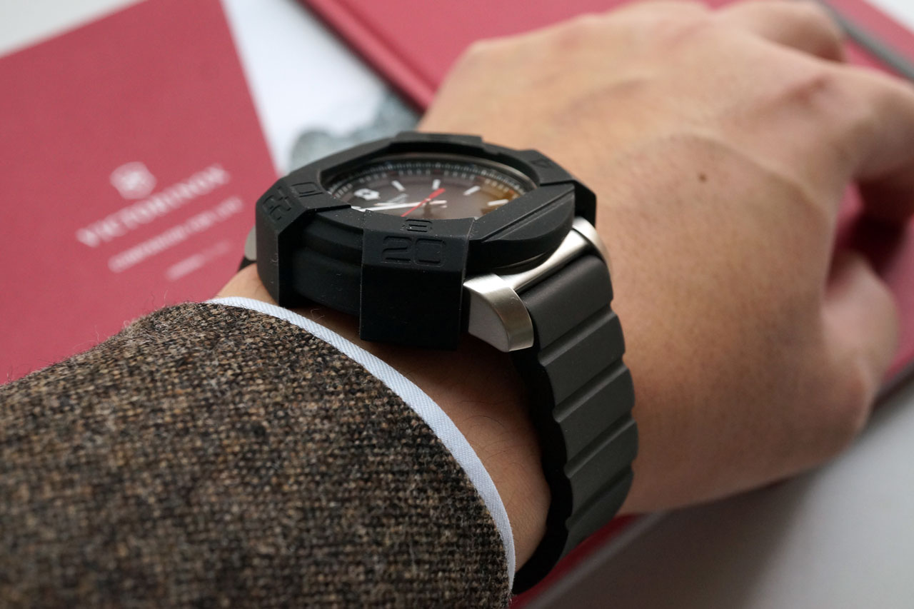 Klokker som Victorinox I.N.O.X. merkes (og enkelte vil si skal merkes) på håndleddet, men med lett buede horn og en tykk men svært behagelig gummirem sitter den komfortabelt på undertegnedes gjennomsnittlige håndledd. Gummiremmen er utstyrt med en vanlig klassisk men kraftig spenne som står i god stil med resten av uret. Er man blant de første som kjøper en I.N.O.X., legger Victorinox dessuten med en flott NATO-inspirert rem i «Real Bond»-aktig mønster, og en liten sveitsisk lommekniv som inneholder et enkelt barettverktøy.
